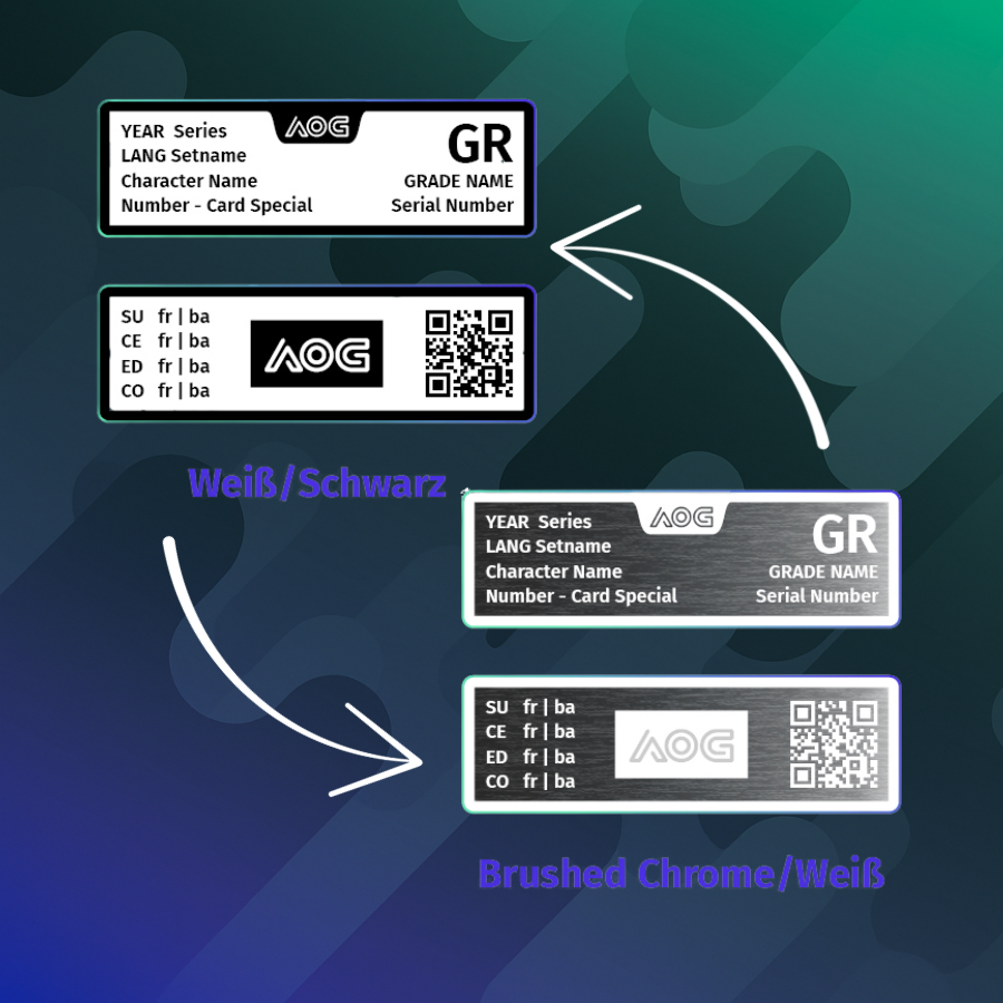 Beim AOG-Grading entscheidest du selbst, welches Label deine Karte erhält. Ob Weiß/Schwarz oder brushed Chrome/Weiß – du hast die Wahl! So passt das Grading perfekt zu deinem Stil und verleiht deiner Karte einen individuellen Look, der sie noch einzigartiger macht.
